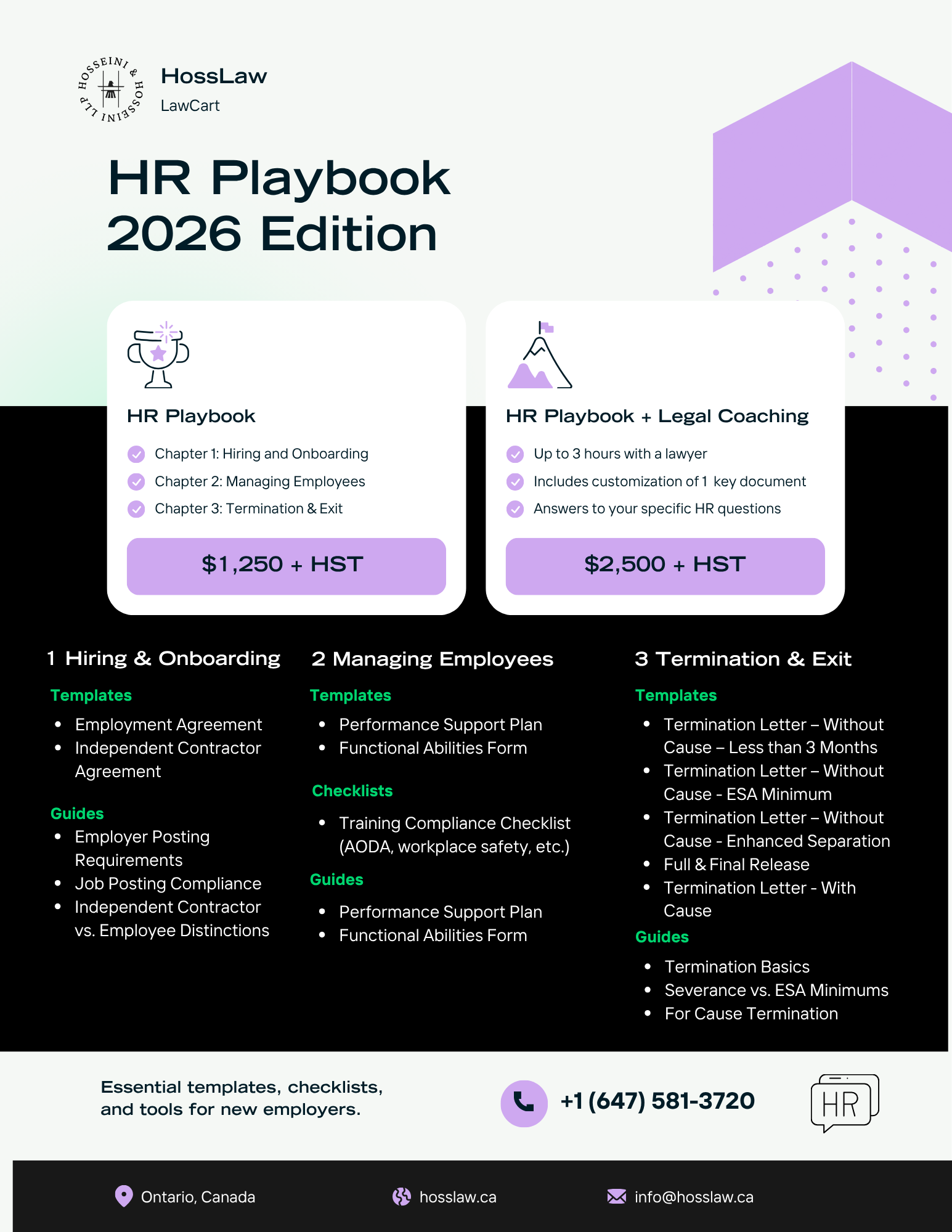 The HR Playbook is a practical, lawyer-drafted toolkit designed specifically for Ontario employers. It includes the core documents, templates, and guidance you need to hire properly, manage employees effectively, and terminate with confidence.
